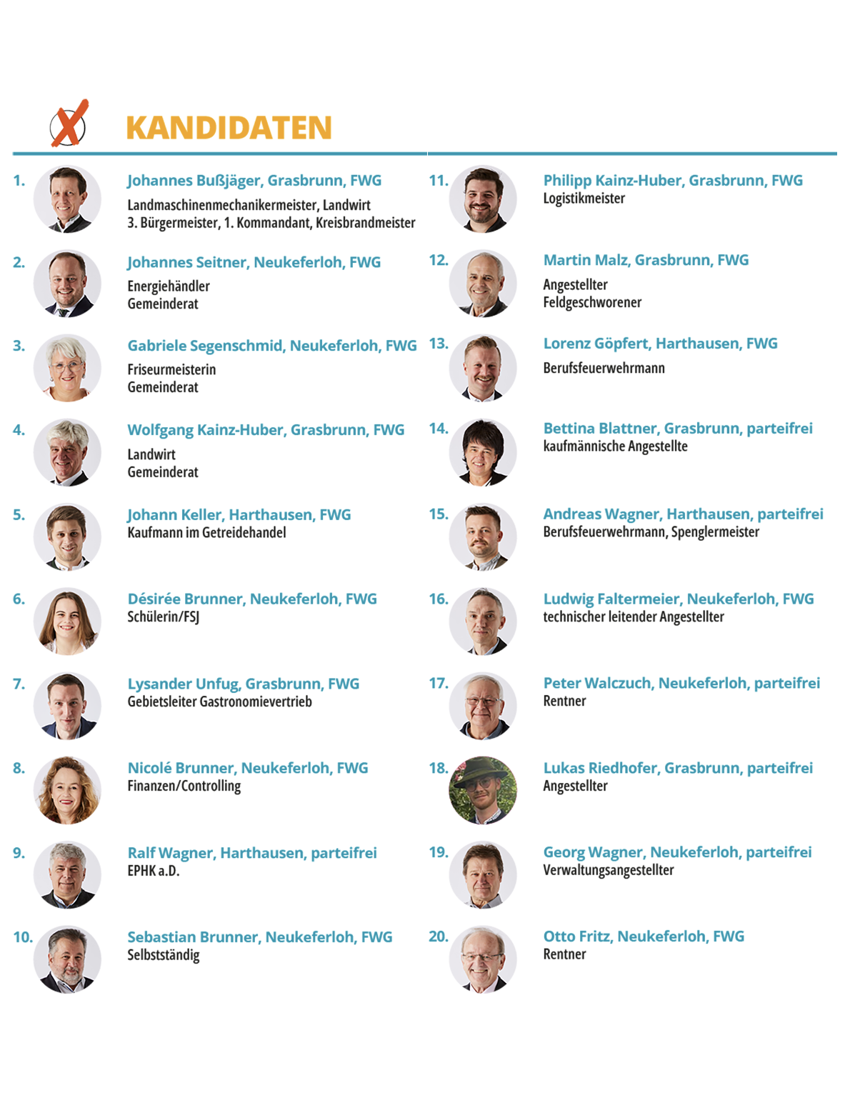 Seit 1977 engagiert sich die Freie Wählergemeinschaft Neukeferloh – Harthausen – Grasbrunn (FWG) ehrenamtlich zum Wohle unserer Gemeinde und ihrer Bürgerinnen und Bürger. Wir orientieren uns nicht an Parteiideologien, sondern folgen dem Gewissen und suchen stets nach den besten Sachlösungen. Als parteifreie Wählergemeinschaft und drittstärkste politische Kraft mit vier Gemeinderäten setzen wir uns mit Engagement für eine lebendige Zukunft Grasbrunns ein. Hier beginnt unsere Reise zu einem besseren Grasbrunn – sachlich, unabhängig und nah an Ihnen.